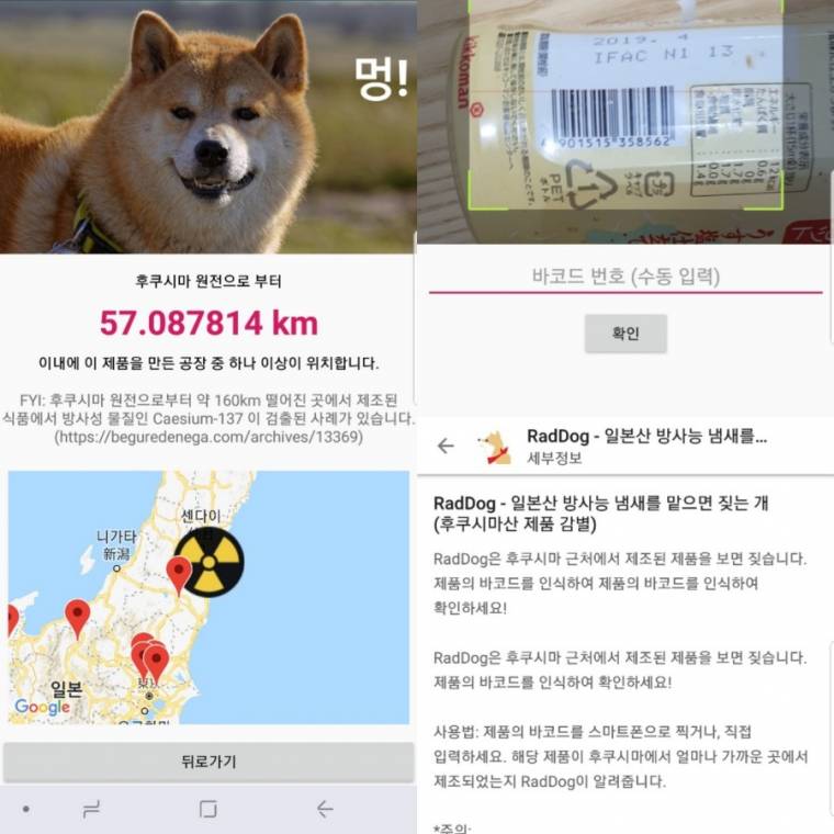 바코드를 찍으면 해당 제품의 제조 공장들을 찾아서, 후쿠시마 원전에서 얼마나 멀리 떨어져 있는지 보여주는 앱이에요.
